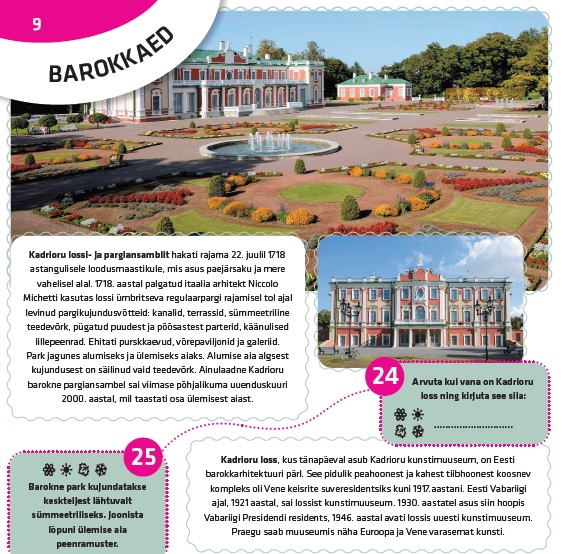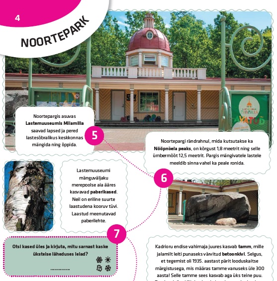 Õpi ja avasta, tegutse ning naudi! Kadrioru kunstimuuseumi ja Kadrioru pargi koostöös valminud teejuht aitab pargis liigelda, avab Kadrioru ajalugu ja annab edasi teadmisi looduskeskkonnast. Teejuht on sobiv nii avastamishimulistele peredele kui ka õppematerjalina õpilasgruppidele.